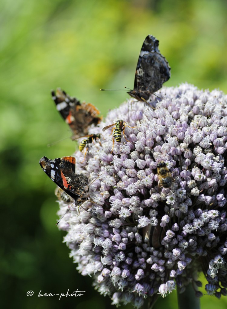Aber auch bei den Gemüsepflanzen gibt es solche, die uns nähren und gleichzeitig nützlich für Insekten sind. Einfach mal zwei oder drei Zwiebeln stehen und zur Blüte kommen lassen. Es muss nicht immer der Zierallium sein, auch normale Zwiebeln, die Winterheckezwiebel oder Porree produzieren beeindruckende Bütenkugeln, auf die Schmetterlinge, Hummeln, Bienen und Schwebfliegen stehen. Die prächtige Blüte des Stangensellerie, der Möhre, des Fenchel oder des Brokkoli und anderer Kohlarten sorgen für viel Leben im Garten. Oder die zierlichen Blüten der Wegwarte. Eine andere Bezeichnung für diese Pflanze ist Endivie oder Zichorie. Viele kennen den leicht herben Geschmack des Endiviensalates, aber wer hat je die hübschen blauen Blüte gesehen, die nach der Überwinterung im Folgejahr erscheinen? Und auch mein Pflücksalat lockt Insekten an, wenn er seine zarten gelben Blühten in der zweiten Jahreshälfte ausfährt.