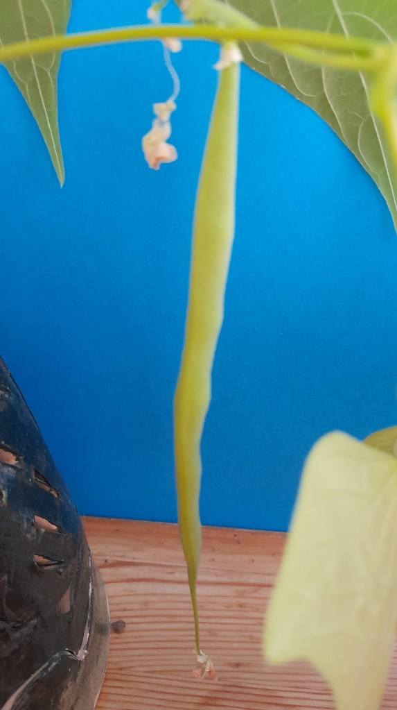 Sobald sich die Bohnenpflanzen zeigten, hielt ich Schneckenwache und freute mich darüber, dass es sieben von zwölf ausgelegten Kernen geschafft hatten so groß zu werden, zu blühen und schließlich lange Hülsen auszubilden.