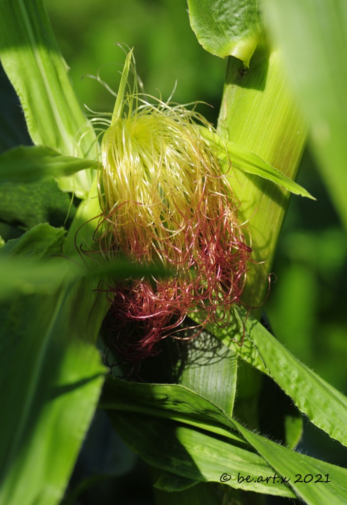 Im Juli hatte ich dann schon schöne Jungpflanzen, die die verlorene Zeit aufzuholen versuchten. Zuckermais hat eine kürzere Kulturzeit als der Popcornmais oder der Mehlmais, deshalb waren meine Anasazi auch schon Anfang August am blühen, während der andere Mais erst im September loslegte. Eigentlich alles viel zu spät, wie sich später herausstellte.