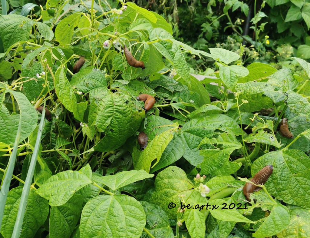Das kühle Frühjahr und die vielen Schnecken machten mir das Leben schwer. Die Schnecken fraßen nach und nach die kleinen Navajopflänzchen auf. Das war umso trauriger als es sich um eine Patenbohne handelte, die ich zur Vermehrung bekommen hatte. Aber egal wie oft ich auch auf Schneckenjagd ging – es gingen etliche Stunden dabei drauf – ich wurde einfach nicht Herr über diese Invasion. Jeden Abend zog ich bis zu 300! Nacktschnecken auf meine Schaufel und killte sie. Ich stellte auch Bierhūtchen auf, in denen sich 50 und mehr Schnecken zum Besäufnis trafen. Ich legte Schafswolle um die Pflänzchen, was nur bedingt half…