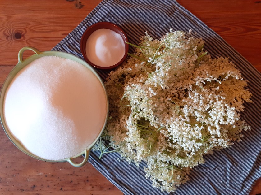 Der für mich schönste Teil kommt gleich zu Beginn: Duftende Holunderblüten sammeln. Am besten wartet man, bis die Blüten „reif“ sind und süß duften, wenn man davor steht. Der Erntetag sollte sonnig sein und es sollte nicht vor Kurzem geregnet haben. So erhält man das schönste Aroma.
